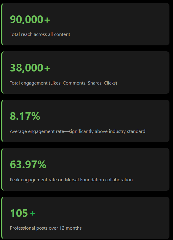 • Strategic Partnerships: Collaborated with Mersal Foundation, reaching 112K with 35K engagements (64% engagement rate) through purpose-driven content.